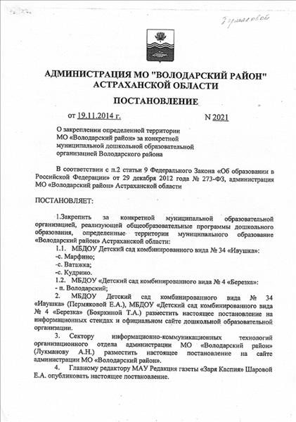 Постановление №30 от 01.02.2016г "О закреплении образовательных организаций за конкретными территориями МО "Володарский район"на 2016 год